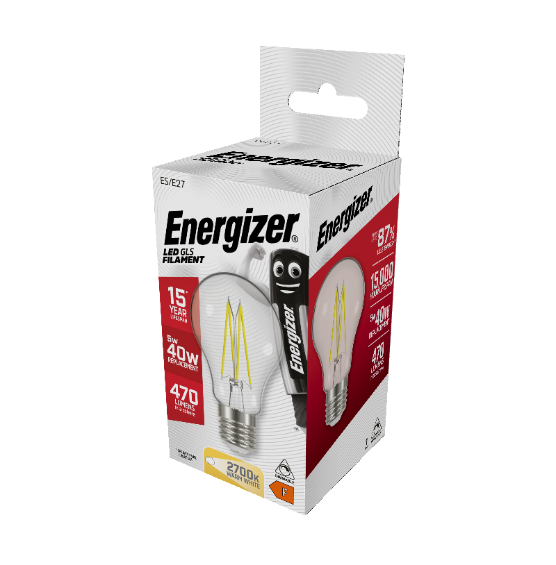 Energizer LED Filament GLS E27 (ES) 470lm 5W 2,700K (Warm White) Dimmable, Box of 1