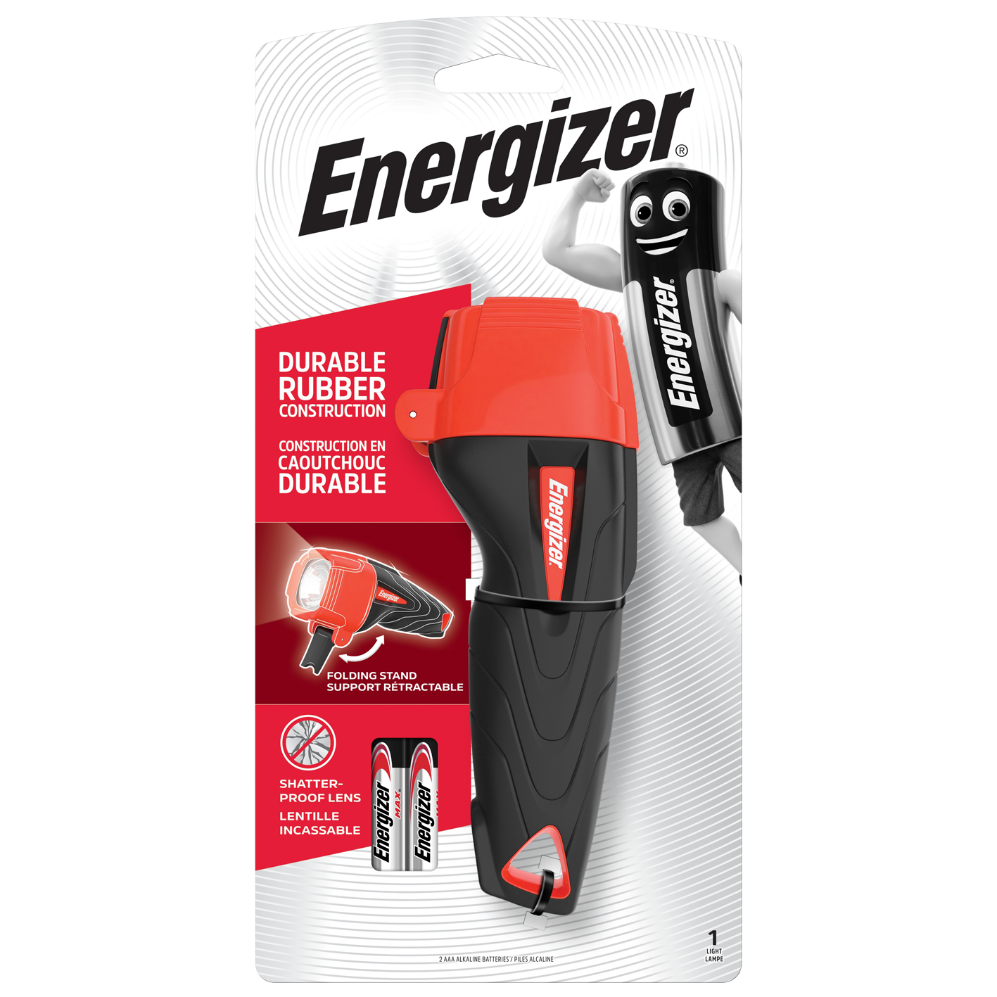 The Energizer Impact Rubber Flashlight features bright LED technology and a durable ergonomic design. This light offers a non-slip, textured rubber handle for ergonomics and enhanced durability. Designed with a convenient, built-in stand, the light provides hands-free use whenever needed. An integrated lanyard loop makes it easy to attach, while the durable push-button switch is designed to last. The Energizer Rubber Flashlight is the ultimate do-it-yourself light that provides excellent performance and reliability for all types of projects.
