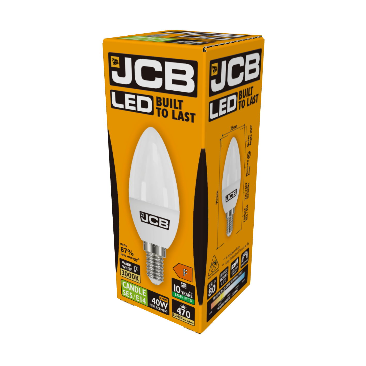 JCB is a truly world-class brand. A brand synonymous with reliability, power and innovation. JCB LED lighting is superb value saving energy and money. This JCB LED Candle E14 cap bulb delivers a soft warm-white glow, using only 4.9 watts replacing the standard 40 watt non-LED bulb.