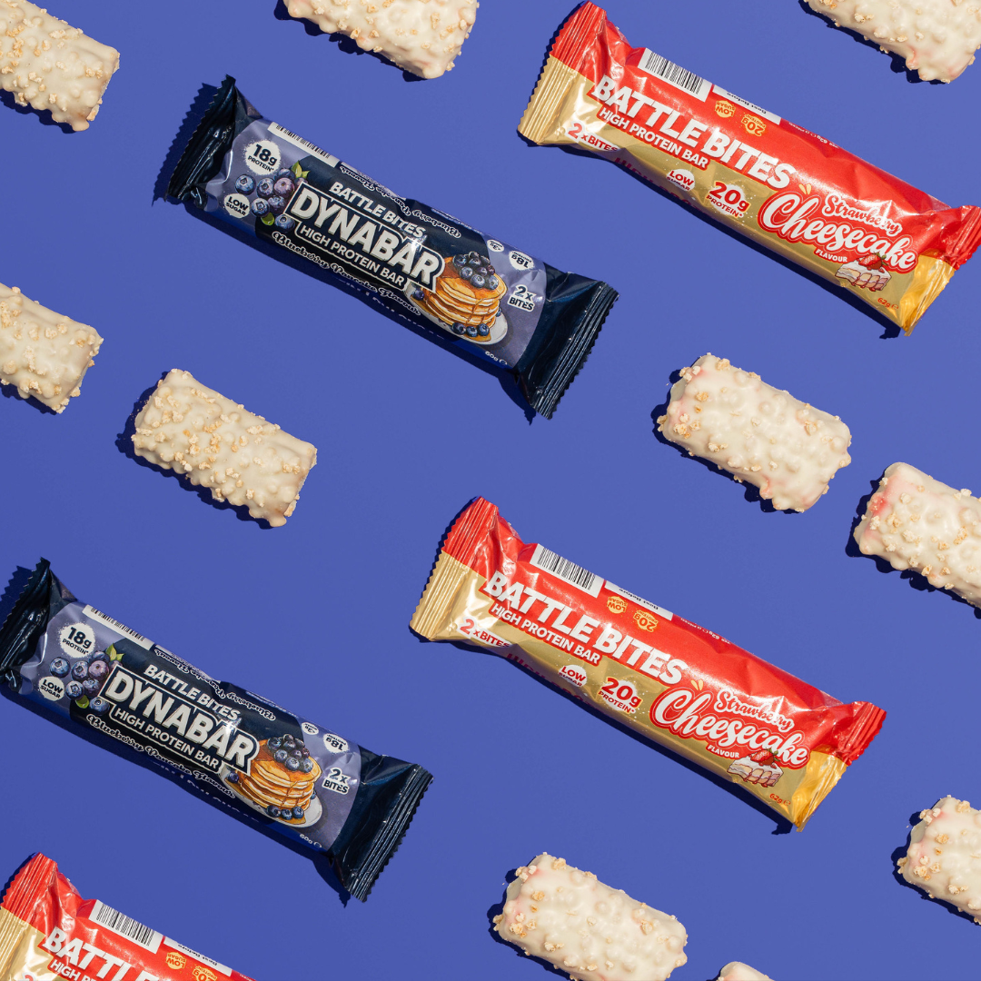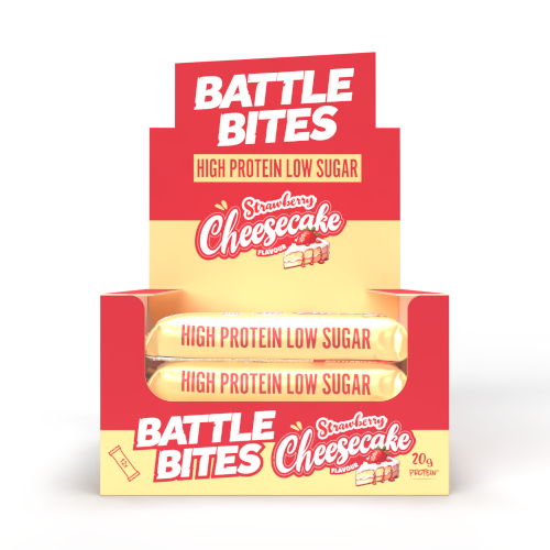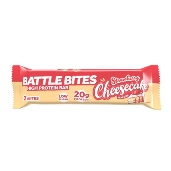 Strawberry cheesecake flavour protein bar with a low sugar caramel flavour layer, with soya nuggets, enrobed in a white flavour coating, topped with biscuit granules, with sugars and sweeteners.
