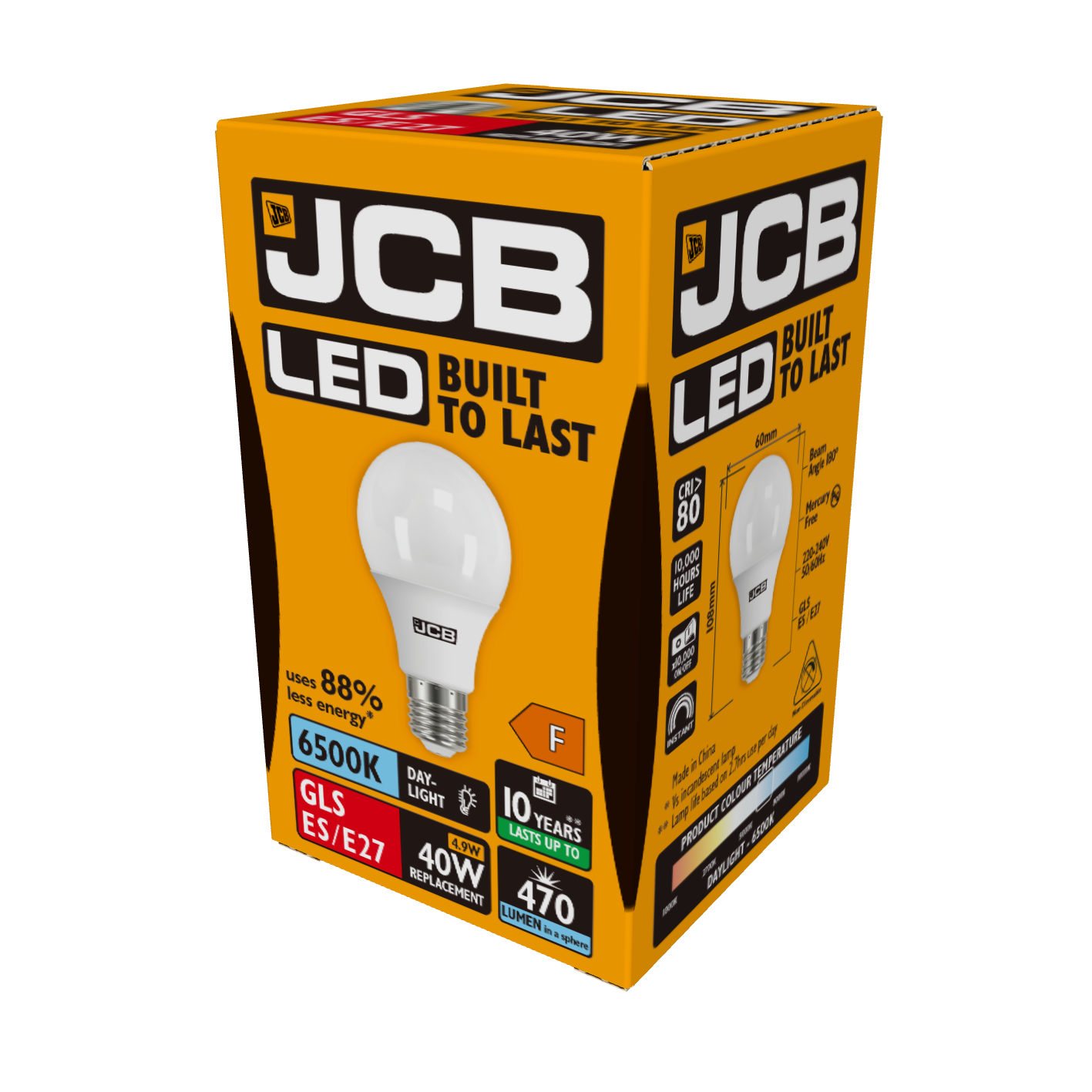 JCB is a truly world-class brand. A brand synonymous with reliability, power and innovation. JCB LED lighting is superb value saving energy and money. This LED GLS E27 cap bulb delivers a daylight glow, using only 4.9w replacing the standard 40w non-LED bulb.