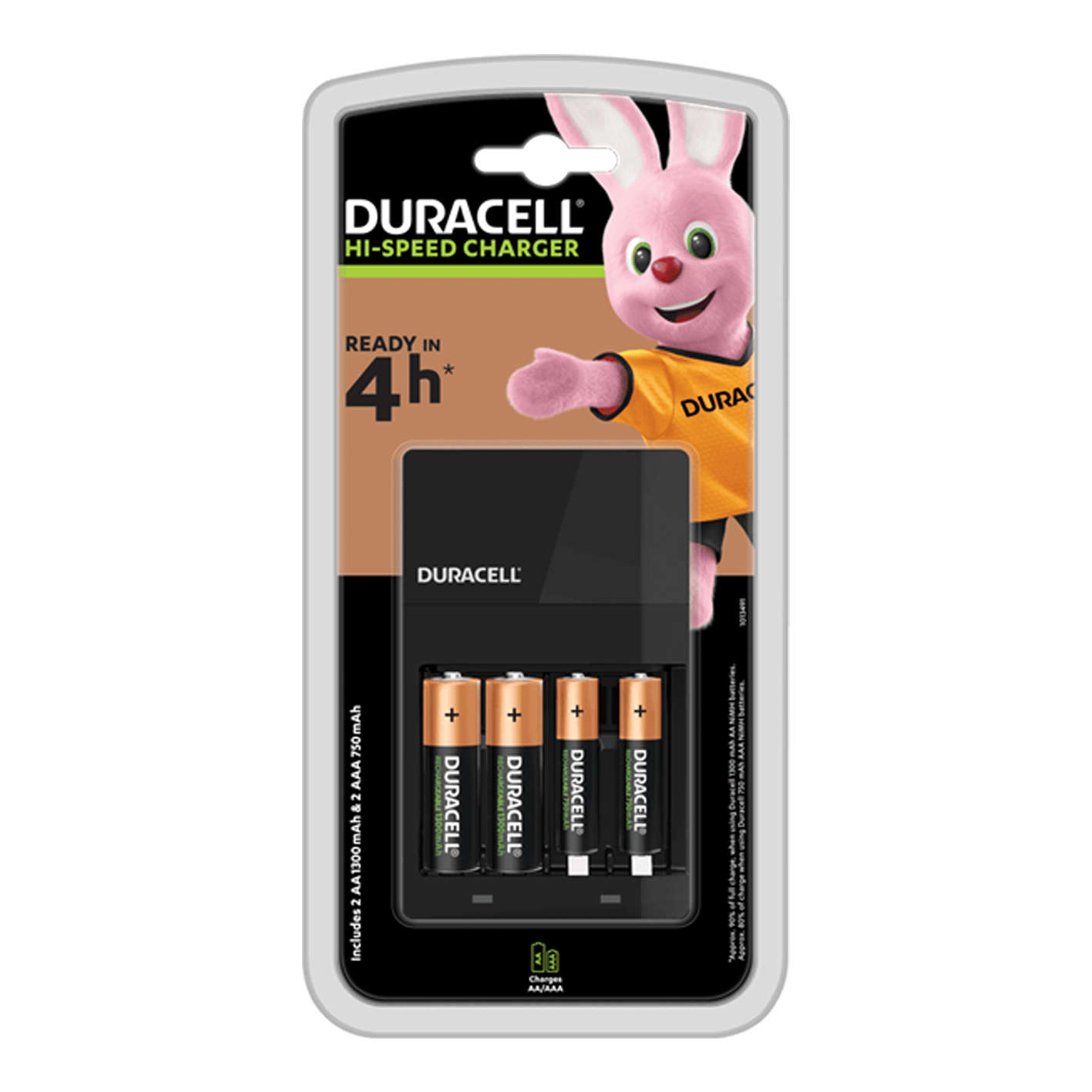 Una solución simple, segura y confiable para sus necesidades diarias de energía, este cargador puede cargar 4 baterías AA en 4 horas. Viene con garantía Duracell de 5 años, indicador de carga parcial y apagado automático para evitar el sobrecalentamiento.