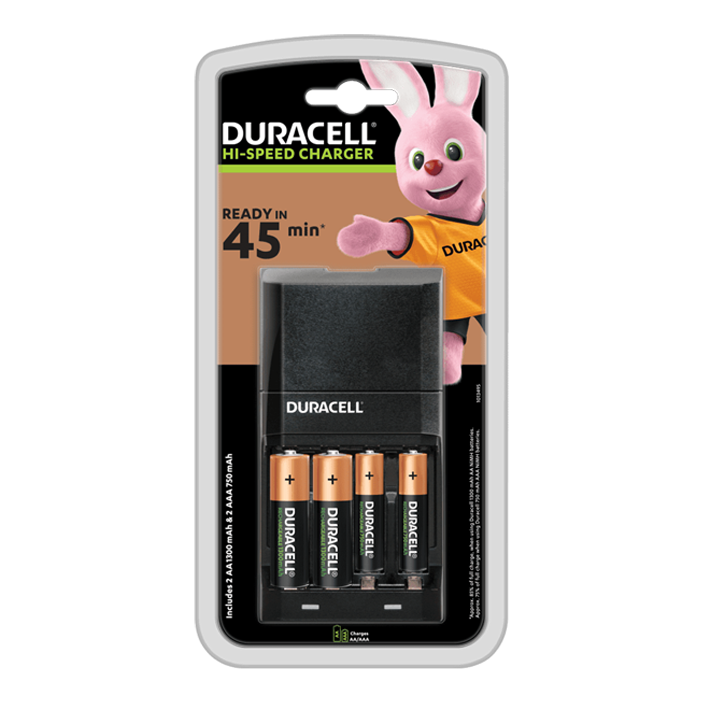 Obtén hasta 4 horas de uso después de solo 15 minutos de carga. Este cargador de alta velocidad puede cargar dos baterías AA en solo 45 minutos, siendo su solución rápida y portátil para ayudarlo a seguir adelante. La garantía de 10 años y nueve características de seguridad, incluido el apagado automático para evitar el sobrecalentamiento, garantizan una energía confiable diaria de Duracell.
